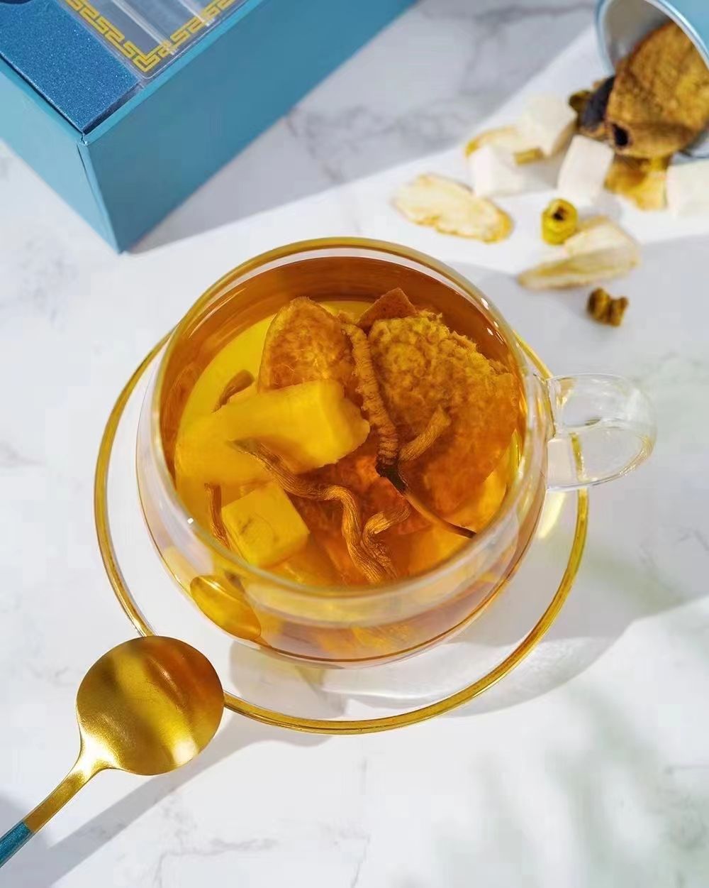 「原料」冬蟲夏草6g,甲魚500g,生曬參2g,香菇10枚,海帶10g,苡米仁5g,淮藥6g,調(diào)料適量。