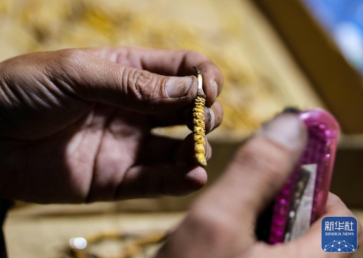 傍晚回到采集點(diǎn)營(yíng)地后,牧民在用毛刷清理蟲草上的土(5月25日攝)。